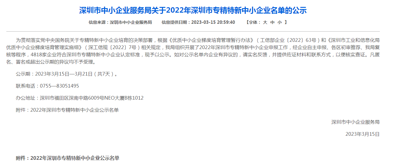 2022年3月15日,深圳市中小企業服務局公布了2022年深圳市“專精特新”中小企業名單,深圳市琉璃光生物科技有限公司名列榜單,榮獲“深圳市專精特新中小企業”稱號,成為發展道路上新的里程碑。